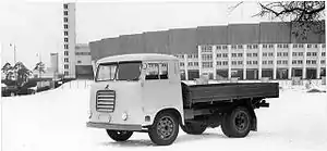 The new model was developed under supervision of Nils Fagerstedt[5] and Senior Engineer Pentti E. Lehtinen. The objective was to design the lorry as light as possible with the biggest possible load capacity. The tyre size selected was 7.50-16", which allowed 1 000 kg load per unit and also a low platform height, and therefore limited the total weight to 6 000 tonnes. The wheelbase was 2 500 mm and the outer dimensions were small, making the lorry agile. A forward-control cabin enabled a 3 450 mm platform length. In order to reduce weight, the frame was joined together completely by welding, instead of riveting, which had been the case in every previous Sisu model. The steel used had almost 50% better tensile strength than the materials used by then. By these actions a weight saving of over 100 kg was reached.[2]