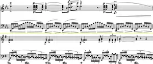 The second piece, referred to as a "glittering showpiece", is positioned in contrast to the lyrical and "atmospheric" melody of the first piece.[8] The piece is in the quick tempo allegretto (quickly), at 92 quarter notes per minute. It is 131 measures long, the most of all six pieces,[13] but the second shortest in terms of playing time, usually no longer than three and a half minutes (the shortest is number four).[2] This piece represents a typical nineteenth-century étude, similar in style to Frédéric Chopin's Études (Opp. 10, 25), with a melody interspersed between rapid sextuplet figures.[2] It is in strict ternary form with a coda: identical beginning and ending sections beginning on measures 1 and 85, and a contrasting middle section starting on measure 45. The second section radically changes dynamics, constantly changing from piano to fortissimo and even sforzando.[13] It is, throughout, a relentless torrent of descending half steps and a cascading left hand figure reminiscent of Chopin's Revolutionary Étude (Op. 10, No. 12, 1831).[2] Ending the piece is a slow coda in Adagio (at ease) which closes with a plagal cadence in E♭ minor.[13]