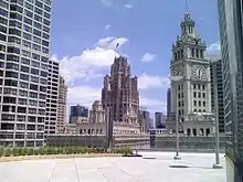 The Terrace, opened on June 25, 2009,[34] has views of the Chicago River and Lake Michigan as well as Navy Pier's seasonal Wednesday and Saturday evening fireworks and was designed for al fresco dining.[35] It is located adjacent to Sixteen on the first setback of the tower,[4] and it was part of a larger 2009 movement to supply al fresco dining options to the Chicago marketplace.[36] The view also features a close-up of the Wrigley Building's clock tower.[37] Although it offered a menu of appetizers and entrees, it was said to focus on serving drinks,[35] and Time Out Chicago describes it as a posh playground for consuming cocktails.[37] The Chicago Sun-Times praised its views and ranked it as the number one al fresco dining venue in Chicago.[38] It was open daily afternoons and evenings, weather permitting.[39]