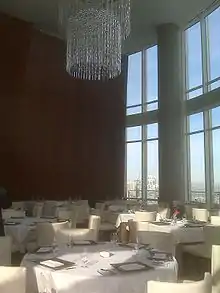 Sixteen had been described architecturally as a sequence of spaces that do not reveal themselves at once, but rather in "procession".[6] The restaurant's foyer is T-shaped, and a passageway to the hotel is lined with floor-to-ceiling architectural bronze wine racks in opposing red and white wine rooms.[4][7][8] The passageway leads to views—praised by Chicago Tribune Pulitzer Prize-winning architecture critic Blair Kamin—that showcase the Wrigley Building clock tower and the Tribune Tower's flying buttresses. Kamin regarded these views to be "more intimate" than the panoramic ones of the Signature Room, a restaurant near the top of the 100-story John Hancock Center.[4] The views were described to be equally impressive by day and by night.[8] The main part of the procession was the Tower Room, a dining room with a 30-foot (9.1 m) dome-shaped ceiling made of West African wood. The dome was furnished with Swarovski chandeliers[9][10] and incorporated mirrors so that all diners can experience the view.[6] The restaurant had two other dining rooms, named for their views: the Bridge Room and the River Room.[11]