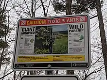Wild parsnip (Pastinaca sativa),[44] also known as poison parsnip, is an invasive plant. Similar to that of giant hogweed the sap containing chemicals that can cause human skin to react to sunlight, resulting in intense burns, rashes or blisters. European settlers have brought them into North America for their edible roots. The plant subsequently has escaped from cultivations into wilderness.[45]