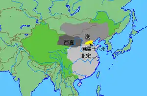 The historian Frederick W. Mote writes that there were actually 19 prefectures but does not specify them.[2] Chinese historians do not consider Yíngzhou (营州; modern Qian'an, Hebei) and Pingzhou (平州; modern Lulong, Hebei) to be part of the Sixteen Prefectures because they had already been occupied by the Liao dynasty during the Later Tang, prior to Shi Jingtang’s cession.[1][3] Yizhou (易州; modern Yi County, Hebei), which fell to the Liao after the cession, is also excluded from the count of 16.[3] The Liao created two new prefectures, Jingzhou (景州 modern Zunhua, Hebei) from Jizhou and Luanzhou (滦州; Luan County, Hebei) from Pingzhou, which have not been included in the original 16.[3]