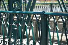 The bridge is 536 feet (163 m) in length, consisting of four parallel cord through Pratt trusses made of wrought iron.[2] The roadway is narrow at 19 feet (5.8 m) wide with two lanes.[2][5] Along each side is a 6-foot wide (1.8 m) sidewalk with ornamental railings. The piers and abutments are masonry and built of local Grand River limestone. The Sixth Street Bridge is the longest and oldest metal truss bridge in Michigan.[2]