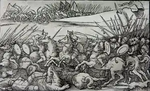Skanderbeg gathered 14,000 men and marched against the Ottoman army.[124] Skanderbeg planned to first defeat Hamza and then to move around Tahip and encircle him.[93] Skanderbeg did not give Hamza much time to prepare and, on 21 July, he assaulted immediately. The fierce attack made short work of the Ottoman force, resulting in them fleeing.[125][126] The same day Skanderbeg attacked Tahip's army and defeated them, with Tahip killed[127] and the Ottomans were thus left without their commander as they fled.[127] Skanderbeg's victory over a ruler even more powerful than Murad came as a great surprise to the Albanians.[96] During this period, skirmishes between Skanderbeg and the Dukagjini family, which had been dragging on for years, were put to an end by a reconciliatory intervention of the Pope, and in 1454, a peace treaty between them was finally reached.[128]