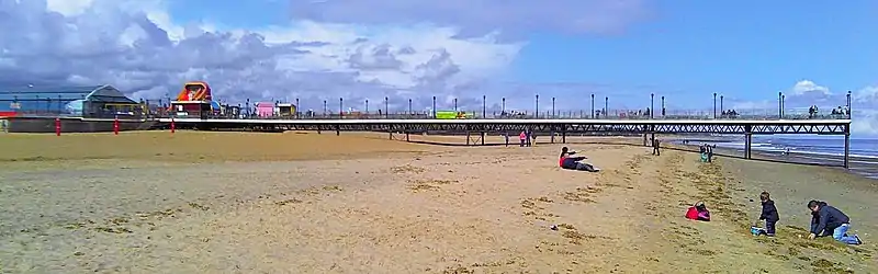 The present day pier length is 118 m (387 ft)[1] long, with no remaining evidence of the former pierhead and shelters.[7] A bowling alley was built in 1992 with a complete refurbishment programme starting in January 2000 to recapture its classic charm.[11] Despite its much reduced length, it is a major landmark along the beach as far as Gibraltar Point to the south and Ingoldmells to the north.