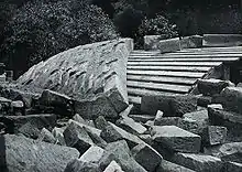The ribbed skew arch is a form of the false skew arch in which several narrow regular arches or ribs, offset laterally with respect to one another, are used to approximate a true skew arch.[66] Motivated by the lack of skilled stonemasons in the 18th century United States, the design was first proposed in 1802 for a crossing of the Schuylkill River in Philadelphia by British-born American architect Benjamin Henry Latrobe[67] and later championed by French civil engineer A. Boucher.[68] Because the series of arch ribs are all regular arches this method of construction has the advantage of being less demanding of unskilled artisans but it has received considerable criticism as being weak, susceptible to frost damage, ugly and wasteful of materials.[69] Although Latrobe's bridge was never built as proposed, his method of construction was later to be used extensively by the Philadelphia and Reading Railroad throughout the Philadelphia area, including an ambitious viaduct designed by Gustavus A. Nicolls with six skewed spans of 70 feet (21 m) across the river and six more land-based skew arches, which was built close to the site of Latrobe's proposed bridge and completed in 1856.[70] Thanks to the reinforcing of the spandrel walls in 1935, the bridge continues to carry rail traffic to this day.[67]