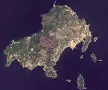 The Municipality of Skiathos includes the islets of Tsougria, Tsougriaki, Maragos, Arkos, Troulonisi and Aspronisi. The municipality has an area of 49.898 km2.[3] They are scattered a few kilometres off the southeast coastline and are clearly visible from the town and the beaches.[2] The island of Skopelos is visible from Skiathos with the more distant islands of Euboea and Skyros visible under very clear weather conditions.