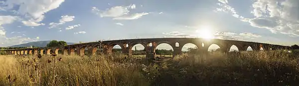 The Skopje Aqueduct (Macedonian: Скопски аквадукт, Albanian: Akudukti) is an aqueduct and archaeological site located in the neighbourhood of Vizbegovo 2 km (1.2 mi) northwest of central Skopje, North Macedonia. The Skopje Aqueduct is the only aqueduct in Macedonia, and one of three largest and well preserved in the former Yugoslavia along with Diocletianus Aqueduct near Split, Croatia and Bar Aqueduct in Montenegro.