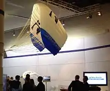 The kite, while 1-2 orders of magnitude larger, bears similarities to the arc kites used in kitesurfing. However, the kite is an inflatable rather than a ram-air kite. Additionally, a control pod is used rather than direct tension on multiple kite control lines; only one line runs the full distance from kite to ship, with the bridle lines running from kite to control pod. Power to the pod is provided by cables embedded in the line; the same line also carries commands to the control pod from the ship.[3]