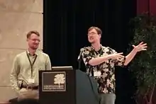Slashdot has received over twenty awards, including People's Voice Awards in 2000 in both of the categories for which it was nominated (Best Community Site and Best News Site).[87] It was also voted as one of Newsweek's favorite technology Web sites and rated in Yahoo!'s Top 100 Web sites as the "Best Geek Hangout" (2001).[88] The main antagonists in the 2004 novel Century Rain, by Alastair Reynolds – The Slashers – are named after Slashdot users.[89] The site was mentioned briefly in the 2000 novel Cosmonaut Keep, written by Ken MacLeod.[90] Several tech celebrities have stated that they either checked the website regularly or participated in its discussion forums using an account. Some of these celebrities include: Apple co-founder Steve Wozniak,[91] writer and actor Wil Wheaton,[92] and id Software technical director John Carmack.[93]