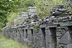 Wales was by now producing more than half the United Kingdom's output of slate, 26,000 tons out of a total UK production of 45,000 tons in 1793.[23] In July 1794, the government imposed a 20% tax on all slate carried coastwise, which put the Welsh producers at a disadvantage compared to inland producers who could use the canal network to distribute their product.[24] There was no tax on slates sent overseas, and exports to the United States gradually increased.[25] The Penrhyn Quarry continued to grow, and in 1799 Greenfield introduced the system of "galleries", huge terraces from 9 metres to 21 metres in depth.[26] In 1798, Lord Penrhyn constructed the horse-drawn Llandegai Tramway to transport slates from Penrhyn Quarry, and in 1801 this was replaced by the narrow gauge Penrhyn Quarry Railway, one of the earliest railway lines. The slates were transported to the sea at Port Penrhyn which had been constructed in the 1790s.[27] The Padarn Railway was opened in 1824 as a tramway for the Dinorwig Quarry, and converted to a railway in 1843. It ran from Gilfach Ddu near Llanberis to Port Dinorwic at Y Felinheli. The Nantlle Railway was built in 1828 and was operated using horse-power to carry slate from several slate quarries in the Nantlle Valley to the harbour at Caernarfon.[28]