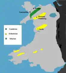 The slate deposits of Wales belong to three geological series: Cambrian, Ordovician and Silurian. The Cambrian deposits run south-west from Conwy to near Criccieth; these deposits were quarried in the Penrhyn and Dinorwig quarries and in the Nantlle Valley. There are smaller outcrops elsewhere, for example on Anglesey. The Ordovician deposits run south-west from Betws-y-Coed to Porthmadog; these were the deposits mined at Blaenau Ffestiniog. There is another band of Ordovician slate further south, running from Llangynnog to Aberdyfi, quarried mainly in the Corris area, with a few outcrops in south-west Wales, notably Pembrokeshire. The Silurian deposits are mainly further east in the Dee valley and around Machynlleth.[5]