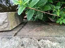 The Slateford Aqueduct has eight arches of 50 feet (15 m) span, and is 500 feet (150 m) long and 75 feet (23 m) high above the Water of Leith.[1] The piers are battered, giving a larger footprint at the base than the top, and the spandrels are hollow, an innovation by Telford.[1] The interior of the stone structure is essentially a setof 5/6? stone arches running in parallel along the length of the bridge, linked and braced laterally at the top of each arch. It is possible to walk the length of the bridge inside the stonework on the north side, from access apertures on the abutments [personal experience] It carries the Union Canal across Inglis Green Road and the Water of Leith at Slateford.[5][6] To the north of the aqueduct, on the side of the accessible towpath, is the parallel Slateford Viaduct, which carries an operational railway.[6][7]