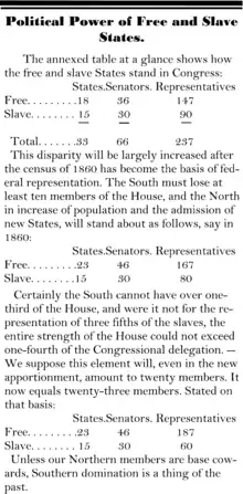 With less than a third of the free population, and less than a third of the wealth, they had eleven Presidents out of sixteen; seventeen Judges of the Supreme Court out of twenty-eight; fourteen Attorney Generals out of nineteen; sixty-one Presidents of the Senate out of seventy-seven; twenty-one Speakers of the House of Representitves out of thirty-three; eighty-four foreign ministers out of a hundred thirty-four; with a like disparity running through all the [illegible] of the General Government.[8]