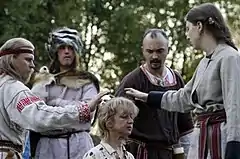 Usually, the organisation of festivals involves three layers of society: there is a patronising "core" of practitioners, who are often professionally affirmed people, usually belonging to the intellectual class; then there is the population of committed adherents; and then there is a loose "periphery" constituted by sympathisers, generally relatives and friends of the committed followers. Aitmurto notes that festivals are usually set in the evenings, the weekends and on public holidays, in order to allow everyone's participation.[218] Shizhenskii and Aitamurto described one Kupala festival, held over the course of three days outside Maloyaroslavets in Russia; at this event, weddings, purification rituals, and name-giving ceremonies took place, accompanied by musical performances, martial arts, and folkloric plays, while a market sold traditional handicrafts.[7] The interplay with the gods and the cycle of nature which they represent is displayed through large-scale ceremonies which Aitamurto defines as "aesthetically lavish", vectors of a great deal of creativity. For instance, the end of winter is marked by burning straw images of Marzanna, the goddess of winter, while celebrating the victory of Yarilo, the god of the full swing of natural forces; the end of summer, instead, is marked by the burial of an image of Yarilo.[219]