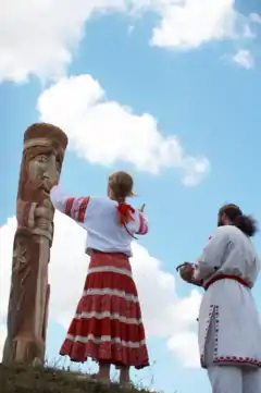 In crafting their beliefs and practices, Rodnovers adopt elements from recorded folk culture, including from the ethnographic record of the nineteenth and twentieth centuries.[37] Practitioners often legitimise the incorporation of elements from folk culture into Slavic Native Faith through the argument that Slavic folk practices have long reflected the so-called "double belief" (dvoeverie), a conscious preservation of pre-Christian beliefs and practices alongside Christianity. This is a concept that was especially popular among nineteenth-century ethnographers who were influenced by Romanticism and retains widespread popularity across Eastern Europe, but has come under criticism in more recent times.[38] Slavic Christianity was influenced by indigenous beliefs and practices as it was established in the Middle Ages and these folk practices changed greatly over the intervening millennia;[39] according to this, Rodnovers claim that they are just continuing living tradition.[40]