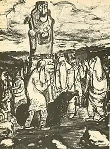 There were also holy places with no buildings, where the deity was believed to manifest in nature itself; such locations were characterised by the combined presence of trees and springs, according to the description of one such sites in Szczecin by Otto of Bamberg. A shrine of the same type in Kobarid, contemporary Slovenia, was stamped out in a "crusade" as recently as 1331.[36] Usually, common people were not allowed into the presence of the images of their gods, the sight of which was a privilege of the priests. Many of these images were seen and described only in the moment of their violent destruction at the hands of the Christian missionaries.[4] The priests (volkhvs), who kept the temples and led rituals and festivals, enjoyed a great degree of prestige; they received tributes and shares of military booties by the kins' chiefs.[17]