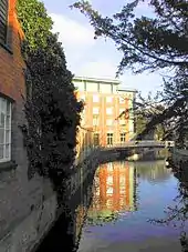 Canalisation of the River Slea began in the 1790s. Canals in England were constructed from the 1760s to make inland trade easier; Sleaford's businessmen were keen to benefit from these. Sleaford Navigation opened in 1794.[51][53] It eased the export of farm produce to the Midlands and the import of coal and oil. Mills along the Slea benefited and wharves were constructed around Carre Street.[54][55] Between 1829 and 1836 the navigation's toll rights increased in value 27 times over.[54] The railways emerged in the 19th century as an alternative to canals and arrived at the town in 1857, when a line from Grantham to Sleaford opened.[56][57] This made trading easier and improved communications,[n 6][58] but led to the decline of the Navigation Company. Income from tolls decreased by 80 per cent between 1858 and 1868; it made its first loss in 1873 and was abandoned in 1878.[59] The town's rural location and transport links led in the late 19th century to the rise of two local seed merchants: Hubbard and Phillips, and Charles Sharpe; the former took over the Navigation Wharves, and the latter was trading in the US and Europe by the 1880s.[60] The railway, Sleaford's rural location and its artesian wells, were key factors in the development of the 13-acre (5-hectare) Bass & Co maltings complex at Mareham Lane (1892–1905).[61]