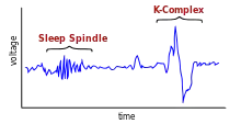 Sleep spindles are short and intense bursts of neurons firing in sync, occurring in the thalamo-cortical networks. These peak late in the night and are defining characteristics of stage two sleep. Sleep spindles are thought to aid in information consolidation during sleep and have been shown to increase after training on a motor task.[15]