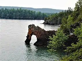 The park occupies most of the lower portion of the peninsula excluding the area around the seasonal community of Silver Islet, and a portion of Thunder Cape which is designated as the Thunder Cape Bird Observatory.[2] The eastern portion of the park is lowlands, while the western half is terrain composed of cliffs, valleys, and the mesa–cuestas which make up the Sleeping Giant formation. At its eastern edge, it will touch the future Lake Superior National Marine Conservation Area.