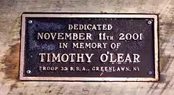 This new section requires crossing the west branch of the Neversink right at the beginning. While it is normally not difficult to follow the stepping stones, the creek can be impassable and even fatal in high water. In December 2000, Timothy O'Lear, a Boy Scout from Long Island drowned when he fell in and was caught under some nearby tree branches when returning after a weekend backpacking trip. He is memorialized with a small plaque on a bench at the beginning of the trail.
