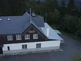 The view tower next to the hut, built in the year 1887 from iron, is 14 metres high, with 56 steps to the top. It was rebuilt for 550.000 Kč and reopened on 5 July 2000.