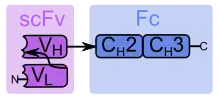 SMIPs are single-chain proteins that comprise one binding region, one hinge region as a connector, and one effector domain. The binding region is a modified single-chain variable fragment (scFv), and the rest of the protein can be constructed from the fragment crystallizable region (Fc) and the hinge region of an immunoglobulin G1 (IgG1). Genetically modified cells produce SMIPs as antibody-like dimers, which are about 30% smaller than real antibodies.[2]