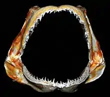 One of the smaller members of its family, the smalleye hammerhead can reach a length of 1.5 m (4.9 ft),[11] though 1.2–1.3 m (3.9–4.3 ft) is more typical,[12] and a weight of 9 kg (20 lb).[10] The body is streamlined and fairly slender. The mallet-shaped cephalofoil is wide and long, with a span measuring 28–32% of the body length; the leading margin forms a broad arch with indentations in the middle and on either side.[13] The cephalofoils of newborns are longer, more arched, and less indented in front than those of adults.[3] The eyes, placed at the ends of the cephalofoils, are proportionately smaller than in other hammerheads and equipped with nictitating membranes (protective third eyelids).[2][3] The nostrils are positioned just inside of the eyes, each with a well-developed groove running towards the center of the cephalofoil. The mouth is strongly curved, containing on either side 15–16 upper tooth rows and 15–17 lower tooth rows. The teeth have single narrow cusps with smooth or weakly serrated edges, that are angled in the upper jaw and upright in the lower jaw.[2][13]