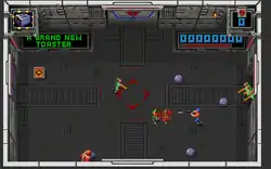 The themes were borrowed from violent, sci-fi films such as RoboCop and The Running Man,[2][3] involves players competing in a violent game show, set in the not-too-distant future. Moving from one room to the next, players have to shoot hordes of enemies who enter via passages on each side of the screen while also collecting weapons, power-up items, and gift-wrapped prizes. The final room in each level is a protracted fight with a boss.