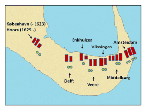 In its first year only Amsterdam and the Danes occupied Smeerenburg, the former to the east and the latter to the west. In 1619 and 1620 the Danish ships that went to Smeerenburg were sent by merchants from Copenhagen, while those that went there in 1621 and 1622 were sent by a royal undertaking. In 1623 two Basque ships employed by the Danes arrived at Smeerenburg and began taking whaling gear from the Danish huts before they were driven away by the Dutch. In 1625, when the Danish-employed Basque ships arrived at their place in Smeerenburg they found that their station had been damaged, the work of the Dutch and English in the previous season.[4] After 1625 the Danes were expelled by the Dutch, their place being occupied by the Hoorn, Enkhuizen, and Vlissingen chambers. By 1626 there were five big "huts" at Smeerenburg, and by 1633 all the chambers of the Northern Company were represented at the settlement.[5]