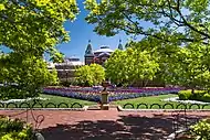 Around 1900, the wooden floor of the Great Hall was replaced with terrazzo and a Children's Museum was installed near the south entrance. A tunnel connected to the Arts and Industries Building. A general renovation took place in 1968-70 to install modern electrical systems, elevators and heating, ventilation and air conditioning systems.[3] The Enid A. Haupt Garden was dedicated in 1987, along with the Renwick Gate facing Independence Avenue, built from Seneca redstone retrieved from the demolished D.C. Jail. [8]