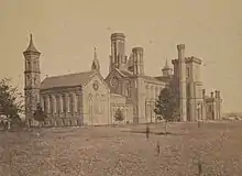 Initially intended to be built in white marble, then in yellow sandstone,[4] the architect and building committee finally settled on Seneca red sandstone from the Seneca Quarry in Montgomery County, Maryland. The redstone was substantially less expensive than granite or marble, and while initially easy to work, was found to harden to a satisfactory degree on exposure to the elements.[5] Scholarly evidence indicates it is likely that slaves were employed at Seneca in quarrying stone for the Castle, though no evidence has surfaced that slaves were involved in the actual Castle construction.[6]