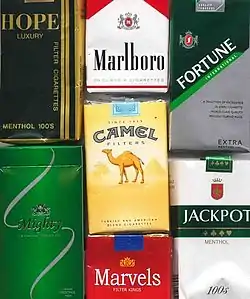 The Filipinos' preferred tobacco product is the cigarette,[2] the most popular brand being Marlboro.[22] It is estimated that each adult smoker consumes 838[23] cigarettes, equating to about 42 cigarette packs, per year.