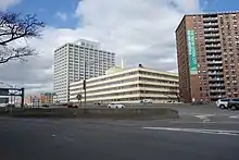 Similarly, in the late 1970s, SSA, the General Services Administration, and the Carter administration devised a plan to move the program service center from its main location, in two leased buildings on Horace Harding Expressway in Lefrak City in Rego Park, to a new federal building planned for a revitalization zone in the center of the Jamaica area of Queens.[26][27] The move was championed by Congressman Joseph P. Addabbo, who represented Jamaica and whose district would gain the over 2,000 federal workers involved, but was opposed by Congressman Benjamin Rosenthal, whose district would lose them.[28] According to Rosenthal, the potential negative impact of the move affected the Elmhurst and Corona neighborhoods most strongly.[29] The move was also supported by Representative Geraldine Ferraro, another powerful Queens figure, who sat on the House Public Works Committee.[26] The dispute was aired in Congressional hearings and embroiled Senator Daniel Patrick Moynihan and developer Richard Lefrak, supporting and opposing the move respectively, as well.[30] In the event, the move went forward and the new, 11-story building in Jamaica – by then named the Joseph P. Addabbo Federal Building, as the congressman had died in the interim – opened in 1988.[31]