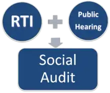A grass roots organisation of Rajasthan, Mazdoor Kisan Shakti Sangathan (MKSS) is believed to have used the concept of the social audit while fighting corruption in the public works in the early 1990s. As the corruption is attributed to the secrecy in governance, the 'Jansunwai' or public hearing and the right to information (RTI), enacted in 2005, are used to fight this secrecy.[5] Official records obtained using RTI are read out at the public hearing to identify and rectify irregularities. "This process of reviewing official records and determining whether state reported expenditures reflect the actual monies spent on the ground is referred to as a social audit." [6] Participation of informed citizens promotes collective responsibility and awareness about entitlements.[7]