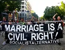 Socialist Alternative's highest profile public representative is Seattle City Councillor Kshama Sawant, who was elected in November 2013.[2] It is active in over 50 cities in the United States,[3] and campaigns for socialist issues. In September 2013, it began publishing a monthly newspaper called Socialist Alternative[4] along with various local newsletters and media outlets, including a radio show in the Boston area. It is a member of International Socialist Alternative, an international organization of Trotskyist parties.