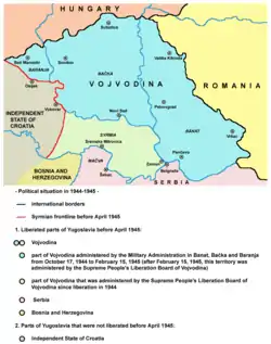 The province was formed in October 1944 when Soviet Red Army and Yugoslav partisans expelled Axis troops from the region. In this time, the final political status of the province was not yet determined and the newly formed provincial administration functioned independently from Serbia. The temporary borders of Vojvodina included the regions of Banat, Bačka and Baranja and most of the region of Syrmia with Zemun. The de jure temporary border between Vojvodina and Croatia in Syrmia was Vukovar-Vinkovci-Županja line. De facto, western parts of Syrmia remained under Axis military control until April 1945. From 17 October 1944 to 27 January 1945, most of the province (Banat, Bačka and Baranja regions) was under military administration.