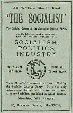 Although deeply influenced by the Socialist Labor Party of America, members of the fledgling British organisation sought their intellectual independence from the start.[6] Whereas the American SLP strongly opposed advancing ameliorative "immediate demands," the new British organisation did not follow, instead initially choosing to adopt a programme of immediate demands matching those of the SDF from whence it sprung.[7] Indeed, there was some discussion as to whether the new party should adopt an altogether different name so as to further delineate themselves from their American counterparts. Trade unionist Tom Bell, a delegate to the inaugural conference, later recalled: