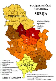 Within Socialist Republic of Serbia two autonomous provinces existed: Socialist Autonomous Province of Vojvodina and Socialist Autonomous Province of Kosovo. The central part of the Socialist Republic of Serbia located outside of the two autonomous provinces was generally known as "Serbia proper" ("Uža Srbija").