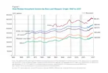 Compared to households who identify as white those who identify as Black or Hispanic have higher rates of poverty. The households who identify as Asian actually have lower rates of poverty whether it is due to higher education here or immigrating already educated and ready to work but one thing is certain this contributes to the model minority stereotype that comes with, bringing along a whole new set of concepts not always good and causes more distance between Asians and other ethnic groups. Regardless of what the difference is between the Asian households and the others the disparities between the others is clear. A little more than twice the percentage of Black households are impoverished compared to white households and Hispanic households are about five percent more likely to be at or below the poverty line. Both Hispanic and Black households have about a six percent amount of households that make less than or double the poverty line compared to white households. As expected these differences also translate when considering households of each ethnic group that bring in six figures or more. Still based on the 2017 U.S. census data the percentage of households that identify as white alone who have over six figure incomes is 32.9%; only 16.1% of households that identify as Black have six figure incomes; 41.7% of households that identify as Asian have six figure incomes; and the percentage of Hispanic households that have six figure incomes or more is 19.8%.[9] Once again the same trend emerges here as with the poverty lines. There are disparities between the white households and the Black and Hispanic households. There are more than twice the percentage of Black households with six figure incomes compared to white households; on the other hand Hispanic households have 13% lower amount of households with six figure incomes comparatively. This shows how extensive the wealth gap is between the ethnic groups because they have more impoverished and less wealthy households. The wealth gap between ethnic groups has been present for a while and can be seen over time as median income in the following figure from the U.S. Census website.