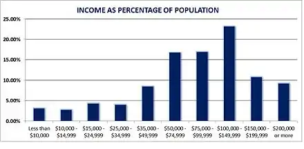 The median income for a household in the CDP was $81,956, and the median income for a family was $89,411. Males had a median income of $60,000 versus $39,224 for females. The per capita income for the CDP was $31,143. About 1.8% of families and 4.3% of the population were below the poverty line, including 1.7% of those under age 18 and 2.3% of those age 65 or over.[10]