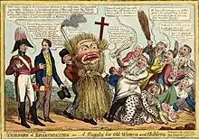 The greatest body, existing, of men of no property, and with whom alliance was to be sought if there was to be a broad union of Protestant, Catholic and Dissenter, were the Defenders.[85] A vigilante response to Peep O'Day raids upon Catholic homes in the mid 1780s, by the early 1790s the Defenders (drawing, like the United Irishmen, on the lodge structure of the Masons) were a secret oath-bound fraternity ranging across Ulster and the Irish midlands. Despite their professed loyalism (members had originally to swear allegiance to the King) Defenderism developed an increasingly a seditious character. Talk in the lodges was of a release from tithes, rents and taxes, and of a French invasion that might allow the repossession of Protestant estates.[86] Arms-buying delegations were sent to London.[87] The Government responded with increasing repression, seconded by the Peep O'Day Boys, local Volunteer companies and later by the Orange Order and the Yeomanry.