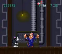 The game begins with Socks observing foreign spies stealing a nuclear missile launch unit in the basement of a foreign embassy.[1] He embarks on a journey through eleven stages through Washington D.C. landmarks like The Pentagon to return to the Oval Office in the White House and alert the Clinton family.[2][3] Throughout the game, Socks must overcome the likes of foreign spies, politicians, the United States Secret Service, and the news media.[3] The bosses are caricatures of political figures, such as Gerald Ford, Jimmy Carter, and Ross Perot.[2][4] In one situation, Socks must push Millie the dog, pet of former president George H. W. Bush, out the front door to avoid Arab terrorist felines.[5] Also, Richard Nixon calls in bomb raids and Ted Kennedy is seen driving a car on a bridge.[6]