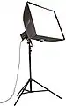 A soft box is a type of photographic lighting device, one of a number of photographic soft light devices. All the various soft light types create even and diffused light[1] by transmitting light through some scattering material, or by reflecting light off a second surface to diffuse the light. The best known form of reflective source is the umbrella light, where the light from the bulb is "bounced" off the inside of a metalized umbrella to create an indirect "soft" light.