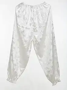 A clothing item similar in function to today's panties was called dari sokgot (다리속곳), which was a wide band of cloth pulled through in between the legs and tied with ribbons at the waist. Above this came the lowest layer of underskirts, called soksokgot (속속곳). One of these layers was a mujigi chima (무지기치마), which itself was sewn of several layers at knee-length, its function was to give shape and volume to the chima, raising it. Above this a daesyum chima (대슘치마) was added. Noble women also wore a noreunbaji (너른바지), a kind of additional underpants.[3]