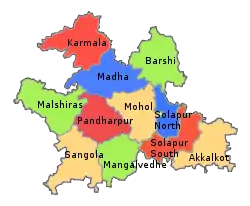 | Vehicle registration | MH-13 (Solapur city)[4] MH-45 (Solapur(Akluj) )[5] MH-62(Solapur rural )[5] |