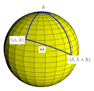 where a, b and c are arc lengths, in radians, of the sides of a spherical triangle. C is the angle in the vertex opposite the side which has arc length c. Applied to the calculation of solar zenith angle Θ, the following applies to the spherical law of cosines: