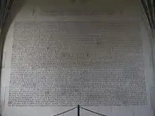 The tower features a dramatic 12-panel stained-glass window that is partly a visual interpretation of John McCrae's "In Flanders Fields", along with 8 smaller stained-glass windows that depict men and women of the armed forces at wartime. This memorial is dedicated to members of the University of Toronto who served in the First and Second World Wars.[3] A museum within the tower showcases a collection of medals, memorial books, portraits, photographs, flags and miscellaneous memorabilia from the period. A memorial stained glass window is dedicated to three University College students (Malcolm Mackenzie, I.H. Mewburn, and William Tempest) killed in the Fenian Raids.[4] High on the wall of the Memorial Room there is a memorial carved in stone for each of the Carillon of 51 bells (iron plus playing console) which memorialize individuals at the University of Toronto who lost their lives in World War I.[5]
