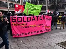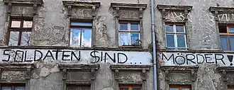 The court case made the expression a popular slogan for peace activists and anti-militarists. Especially starting with the "Frankfurt soldier rulings" in 1984, West German courts were repeatedly concerned with Tucholsky's quote, though there were earlier cases. At a panel discussion in Frankfurt, a doctor of the International Physicians for the Prevention of Nuclear War (IPPNW) and former medical officer cadet said to a Jugendoffizier ("Youth officer", a public relations rank): "Every soldier is a potential murderer - you too, Mr. W. There is a drill for murder in the Bundeswehr".[11] This prompted a long series of judicial proceedings with the accusation of Volksverhetzung ("incitement of the people"). This particular dispute ended in 1992 with a closure of the proceedings with a judgement of minor fault after the Federal Constitutional Court, in a parallel case, annulled a judgement against satirical magazine Titanic, ruling that Tucholsky's wording was protected by the constitution of Germany's article 5, paragraph 1 (freedom of speech).[12]