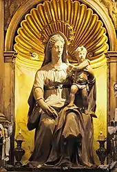 In Rome, in the Basilica of S. Augustine, the feast of the "Maternity of the Blessed Virgin Mary" was celebrated with an octave, in honour of the miraculous statue of the Madonna del Parto by Jacopo Sansovino. For centuries, the people of Rome and its environs have invoked the intercession of the Madonna before this statue asking for safe deliveries and healthy babies. The statue is laden with thank-offerings and always surrounded by offerings of flowers and candles, and often photographs of smiling infants and toddlers, "visual evidence of faith in holy intercession".[12]